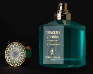 Princesse Zaphira ou le souffle d’un parfum mixte : ce parfum pour homme et femme (Eau de parfum – 260 euros les 100 ml) de la Maison Cataliya mêle force et douceur, tradition et modernité. Sa composition s’articule autour d’un bouquet de fleurs, jasmin et violette en notes de cœur, pastèque et melon en notes de tête, musc blanc, bois de santal, vanille et ambre en notes de fond.