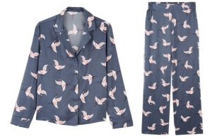 Rouge Gorge ou la douceur satinée : le pyjama Grue rose incarne le raffinement d’une nuit d’hiver, entre la veste gris satin (29,99 euros) et le pantalon coordonné (29,99 euros). C’est une promesse de sérénité absolue pour flâner avec élégance.