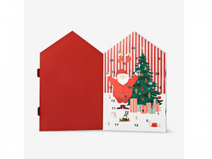 Il est en 100 % carton , 100 % recyclable et est composé de 26 attentions chocolatées dans 24 cases dans lesquelles se cachent des pralinés noirs ou au lait et des carrés déments.