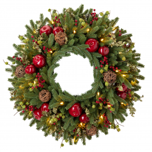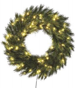 composée de métal et de plastique. Elle peut s’utiliser aussi bien à l’extérieur qu’à l’intérieur. Son diamètre de 60 cm en fait un ornement qui peut trouver sa place sur une porte d’entrée, au-dessus d’une cheminée, sur une table… et qui s’harmonise aussi bien avec un décor moderne qu’avec un style plus traditionnel (49,99 euros).