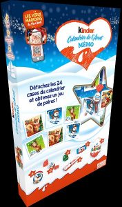 Avec le Calendrier de l’Avent Mémo de Kinder invite les plus petits à rendre l’attente avant Noël encore plus joyeuse en s’amusant. La fenêtre détachable devient une carte permettant de créer un jeu de mémoire en plus des 36 chocolats qu’il renferme : 4 Kinder Surprise, 8 Kinder Chocolat, 6 Kinder Mini Eggs Noisettes, 8 Kinder Schoko-Bons,6 Kinder Chocolat Mini, 4 Kinder Mini Friends éclats de biscuit saveur cacao (14,29 euros).