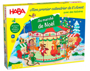 Mon premier calendrier de l’Avent (Haba* – à partir de 2 ans – 32 euros) contient 24 figurines en bois massif, un livre de 24 histoires de Noël et un décor de jeu en 3D avec des détails captivants à découvrir. Chaque jour, en ouvrant une porte, une belle pièce en bois apparait. En écoutant l’histoire de la, les enfants ont la possibilité de reproduire la scène avec les figurines en bois ou inventer leurs propres histoires et en dépliant le plateau de jeu intégré à la boîte, ils peuvent chercher dessus des objets ou scènes évoqués dans chaque histoire et poser la pièce en bois au bon emplacement. Ainsi, le marché de Noël s’anime au fur et à mesure que les jours avancent !