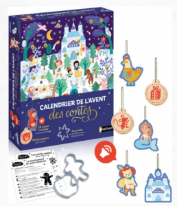 Le calendrier de l’Avent sous forme de coffret (Nathan* – à partir de 4 ans – 29,99 euros) est très joliment illustré pour faire entrer les enfants dans la magie de Noël. Chaque jour, une surprise et un conte sont à découvrir et à écouter (écoute possible également en téléchargeant gratuitement Nathan Live sur l’App Store ou Google Play Store). Parmi les contes : La reine des neiges, Casse-noisette, le loup et les sept chevreaux, Jack et le haricot magique, etc.