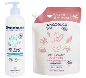 Le gel lavant surgras Rivadouce (bouteille de 500 ml : 12,90 euros – éco-recharge de 1 000 ml : 18,90 euros), conçu pour les peaux sèches ou à tendance atopique, nettoie délicatement le corps et les cheveux de bébé tout en respectant la barrière cutanée. Sa base lavante ultra-douce, enrichie en agents surgraissants, aide à préserver l’hydratation de la peau et à limiter les sensations de tiraillement après le bain. Sa formule sans parfum associe la glycérine végétale pour aider à protéger la peau du dessèchement à la fleur de lotus Bio pour ses vertus adoucissantes et apaisantes.